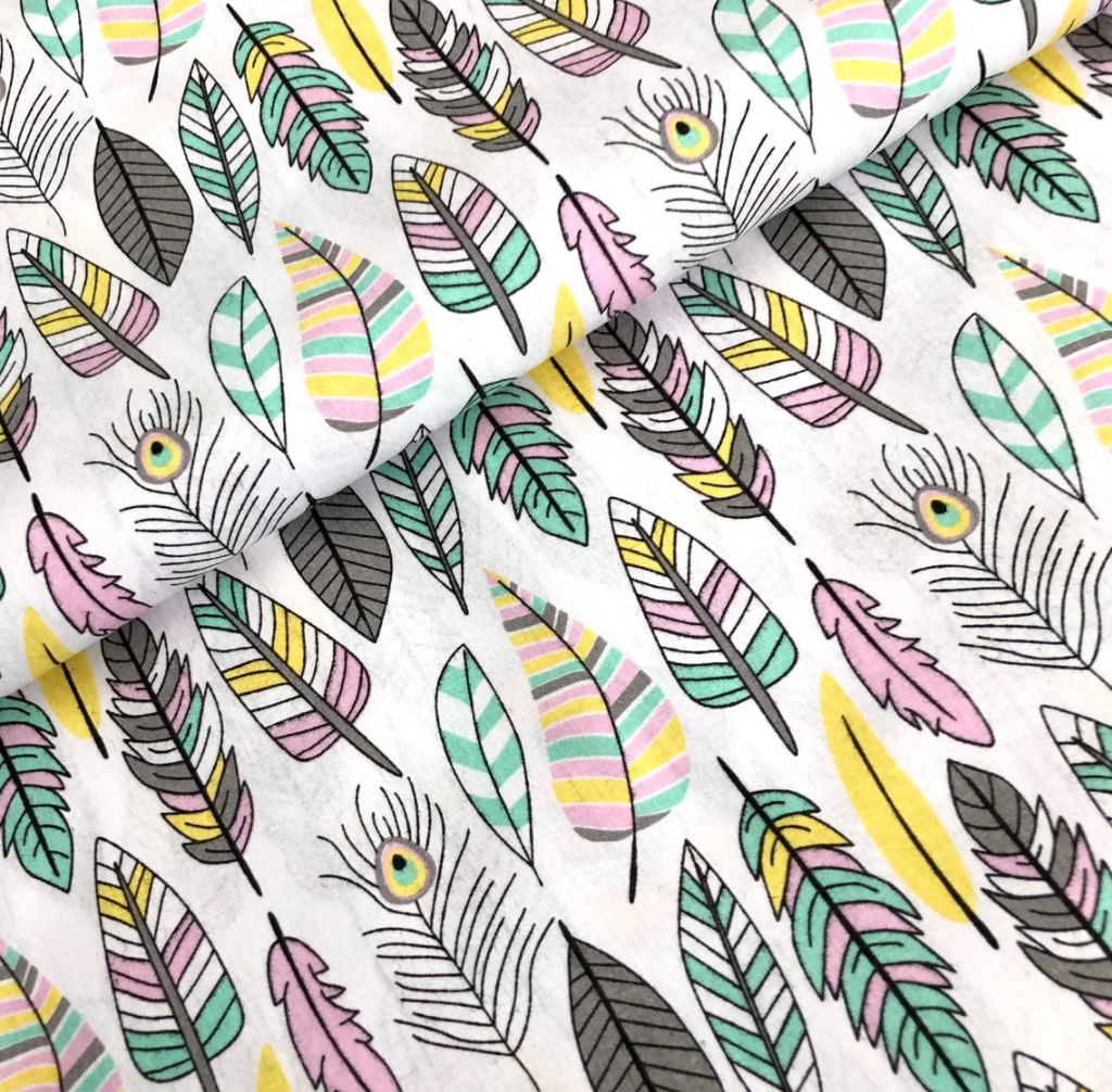 Польська бязь "пір'я великі жовті, сірі, м'ятні на білому"